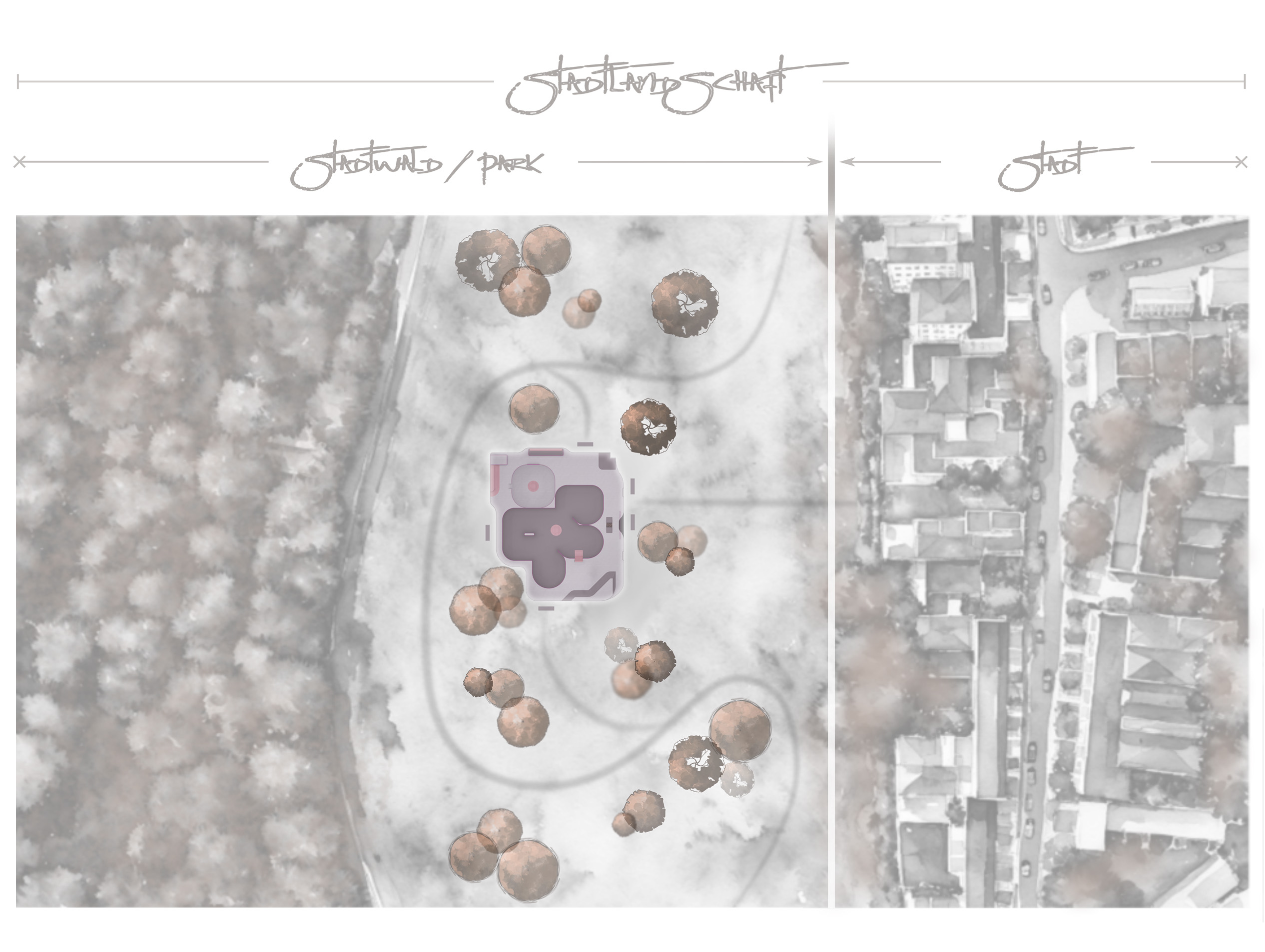 Das Besondere an diesem Projekt ist seine Einbettung in eine natürliche Umgebung. Hohe Bäume spenden Schatten und schaffen ein angenehmes Mikroklima, während die Parkatmosphäre für eine einladende Ruhe sorgt. Besonders im Herbst, wenn die warmen Farben der Blätter in Kombination mit dem Licht- und Schattenspiel auf den Betonflächen wirken, entsteht ein eindrucksvolles Ambiente.